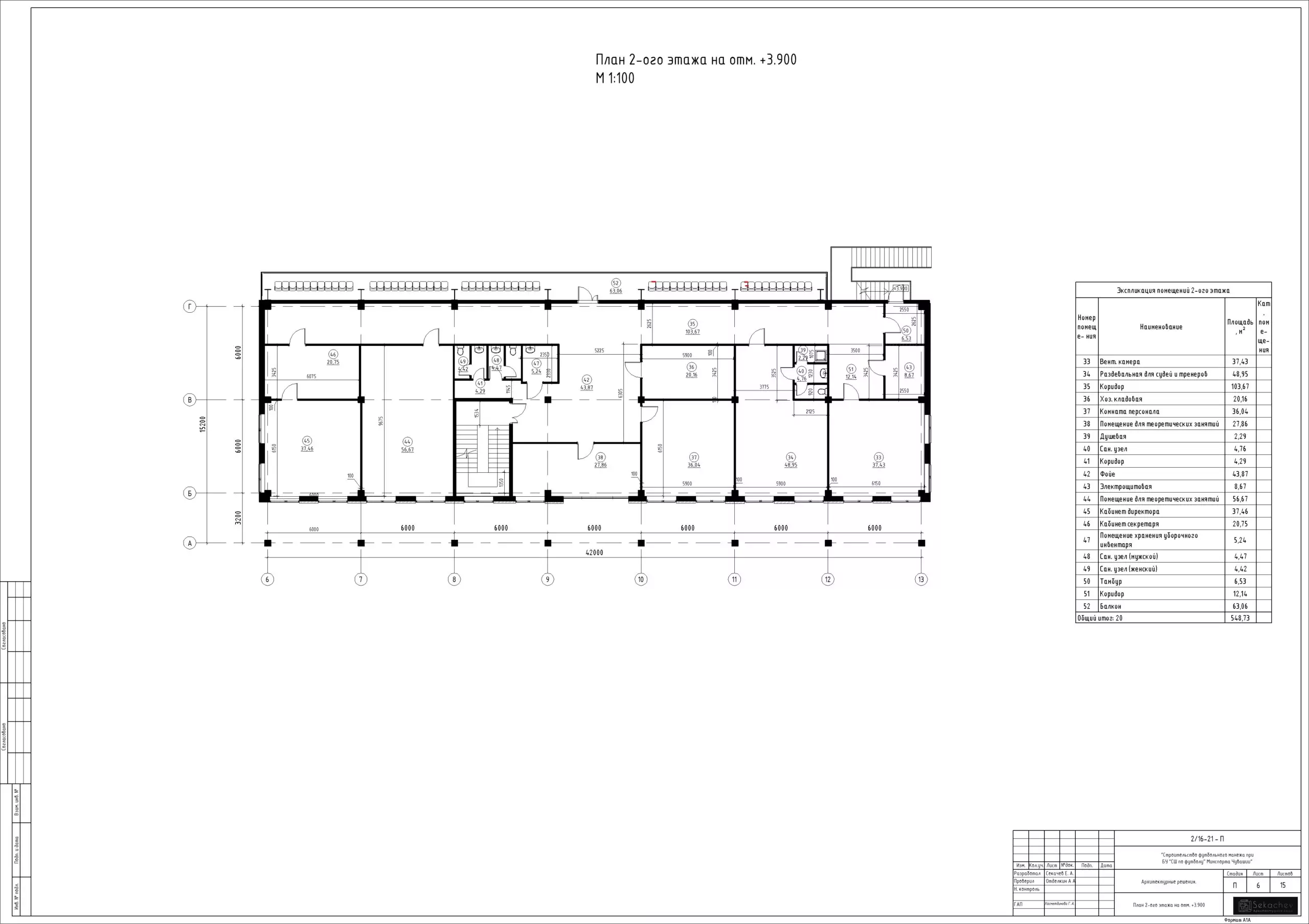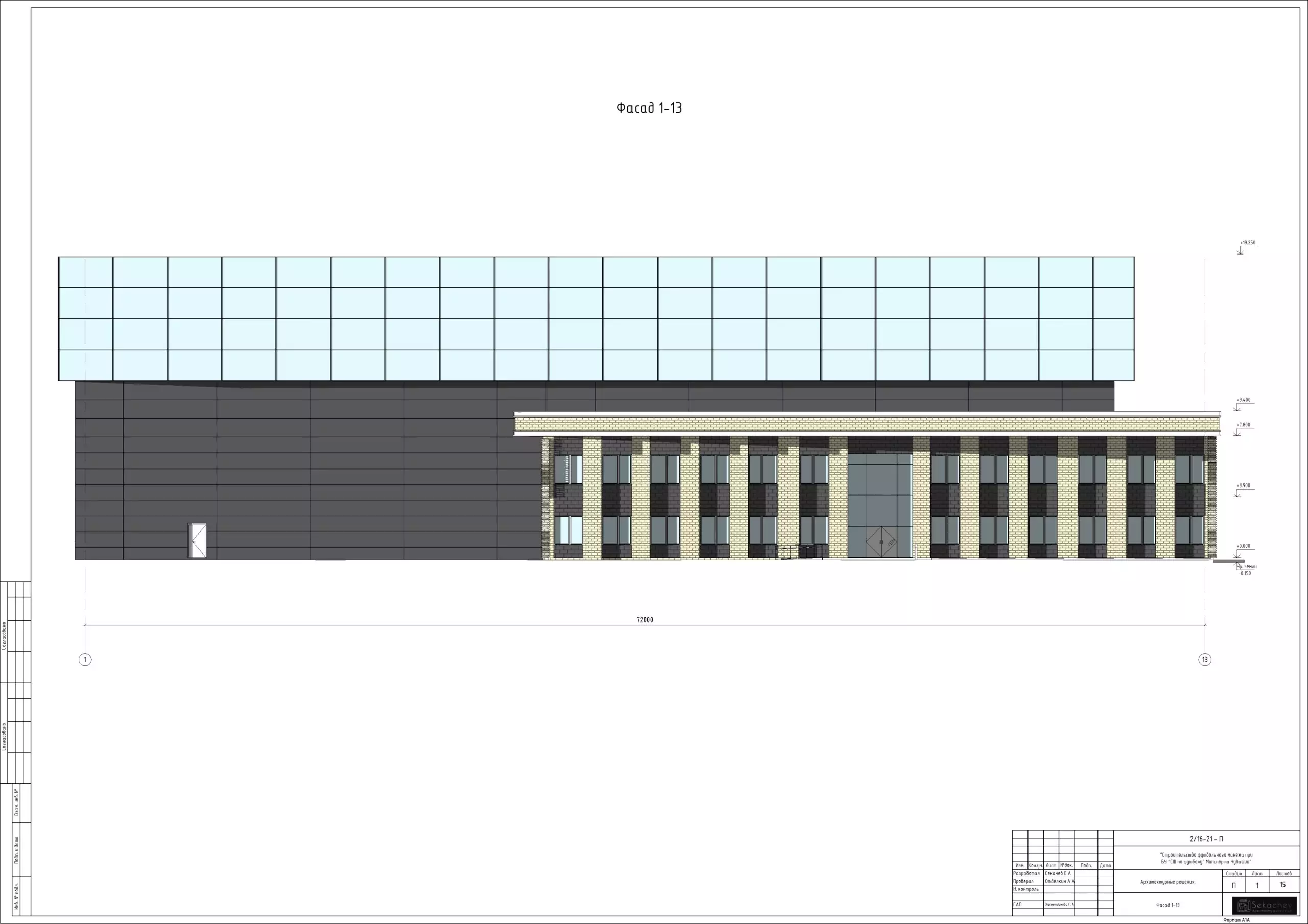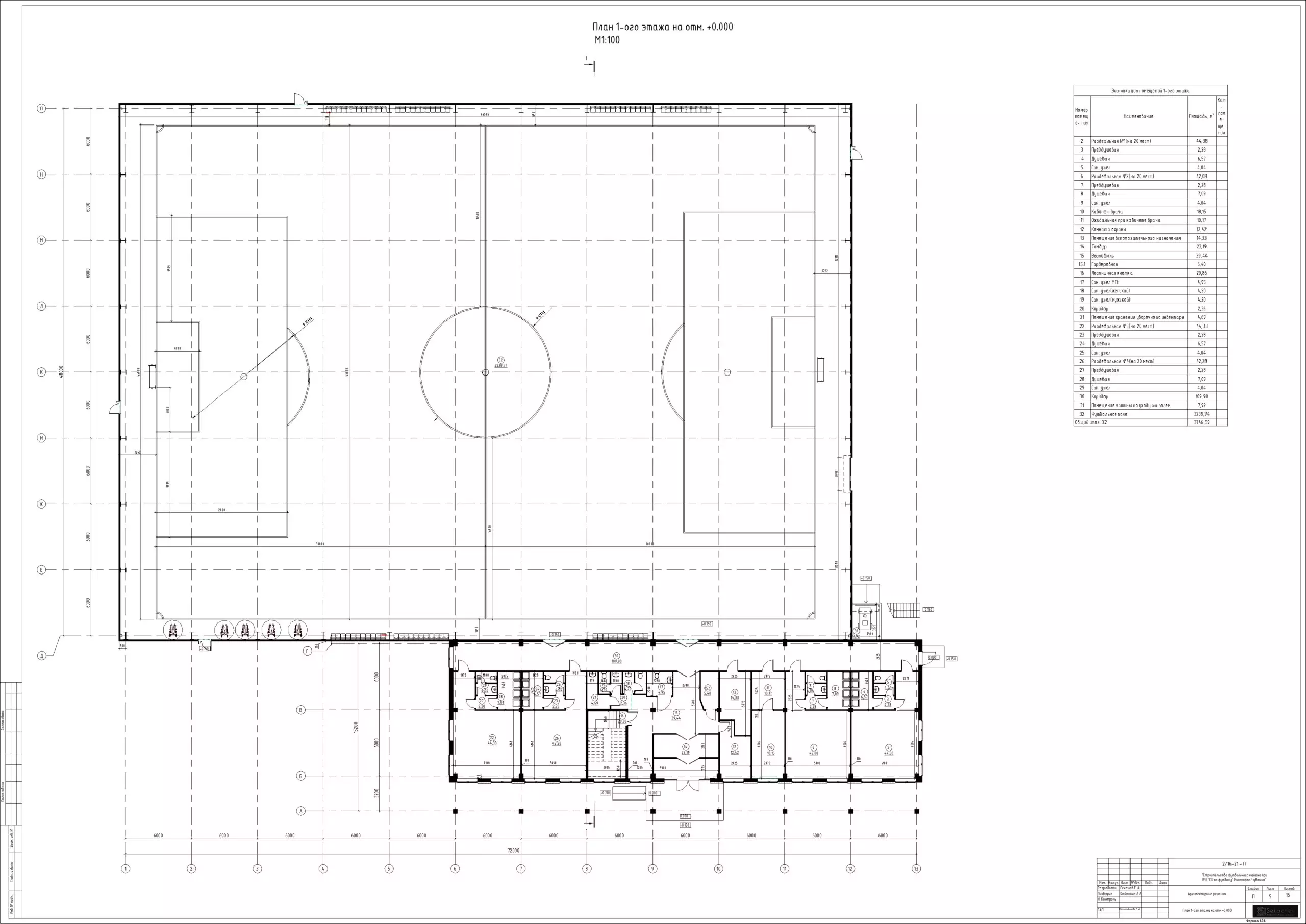 1 этаж содержит следующие помещения: 4 раздевалки на 20 мест каждая, сан. узлы, в том числе для мгн, душевые, мед. кабинет, вспомогательные помещения и футбольное поле. Предусмотрен пандус с уровня земли На 2-ом этаже располагаются: раздевалки для судей и тренеров, комната персонала, помещение для теоретических занятий, вспомогательные помещения, сан. узлы.