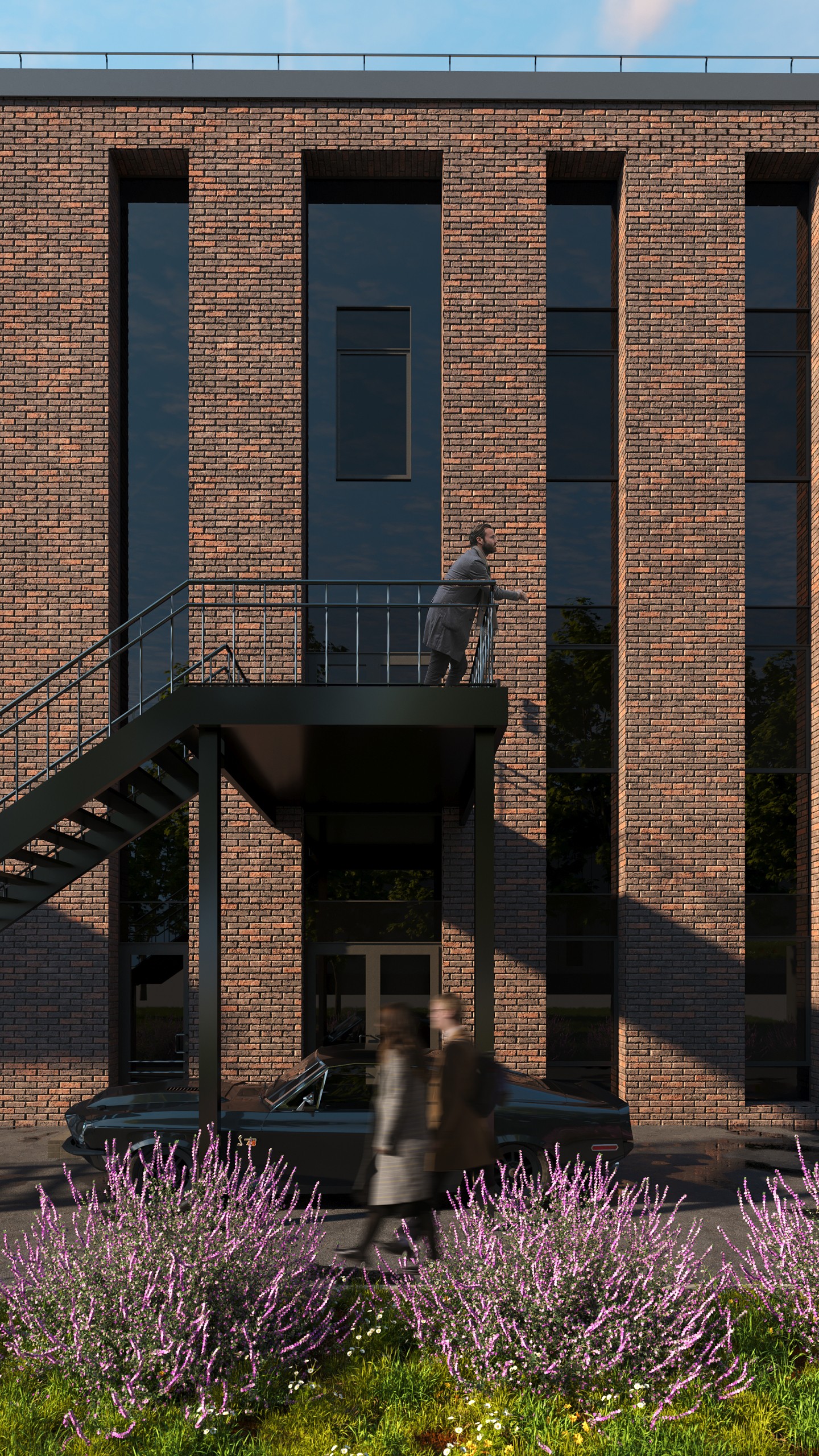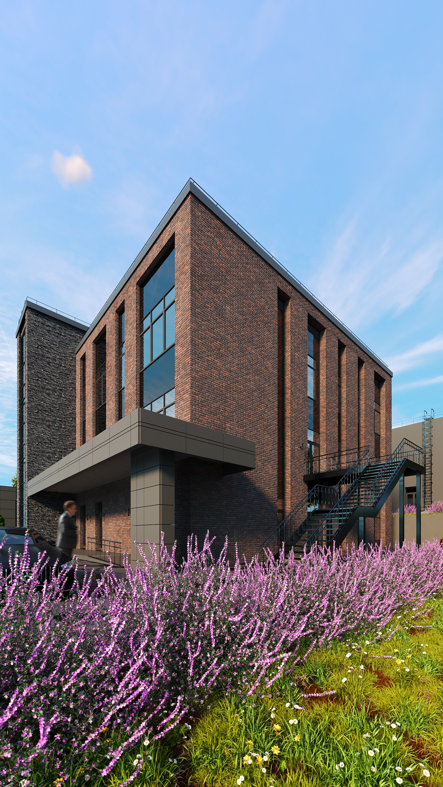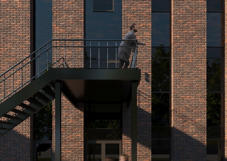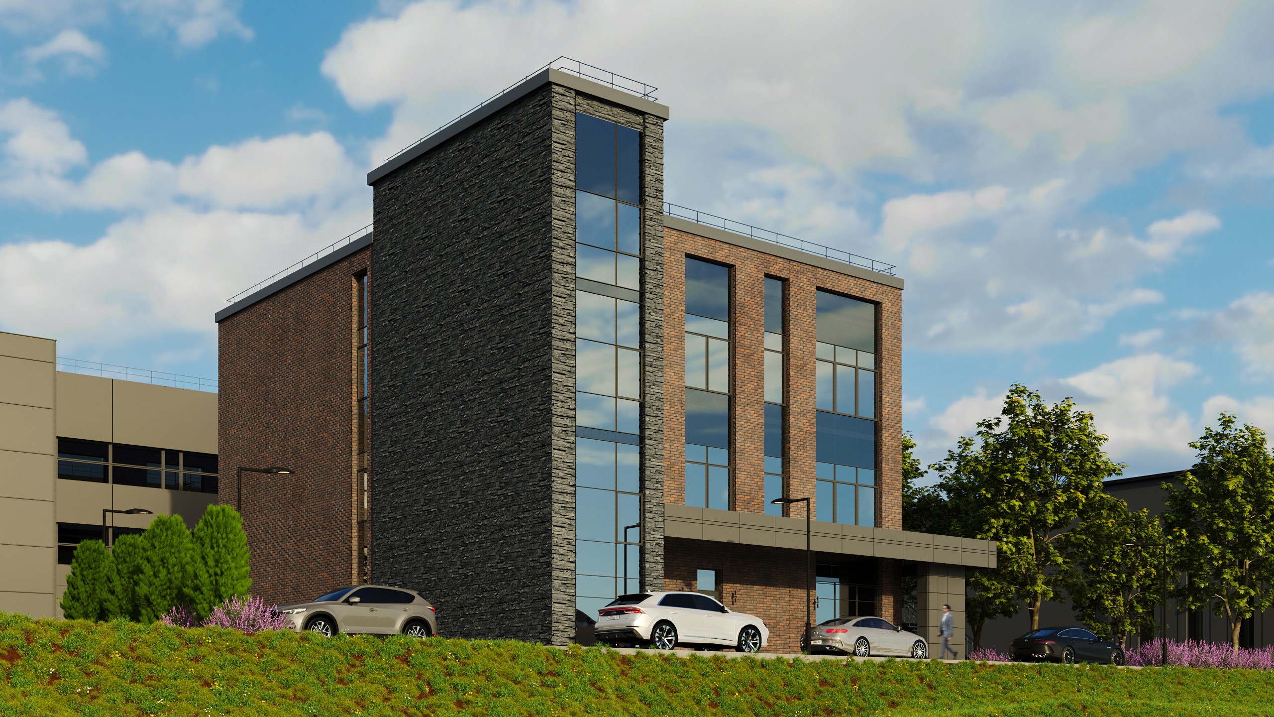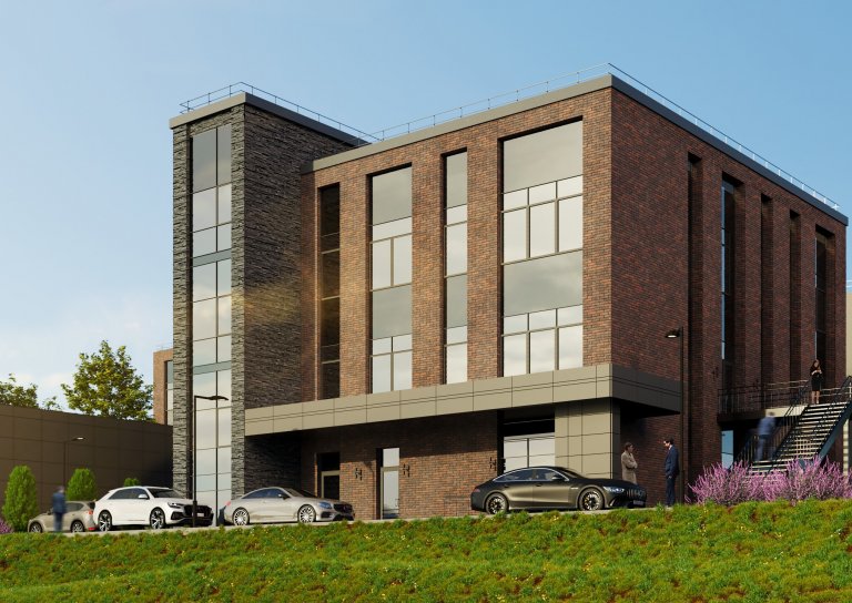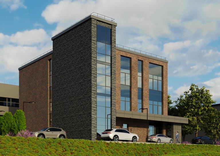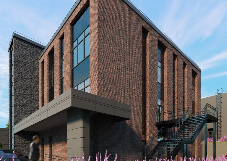 Здание представляет собой трехэтажный объем прямоугольной формы с акцентированно выступающей лестничной клеткой. Конструктивная система-каркасная. Вертикальными несущими элементами являются железобетонные колонны, ядро жесткости. Горизонтальными- железобетонные перекрытия. Внешним элементом отделки является плитка из искусственного камня на системе вент фасада с заполнением стемалитом.
