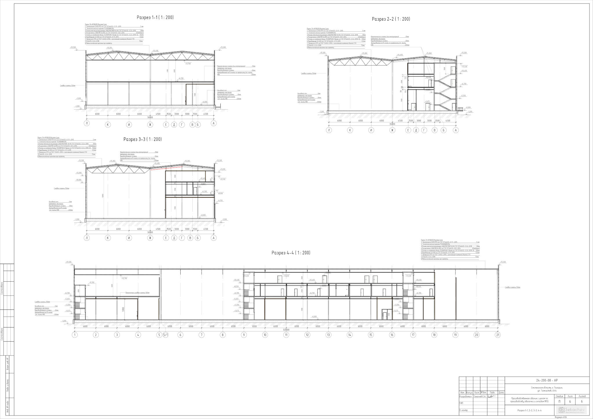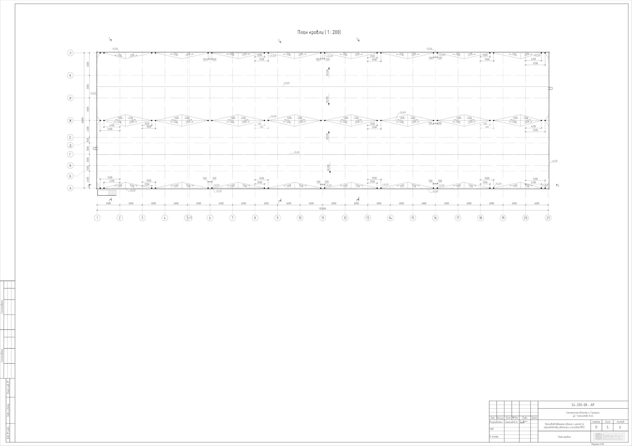 Проектируемый объект имеет прямоугольную форму в плане с размерами 120х36. Наибольшая отметка-конек кровли, равная 18.5м.